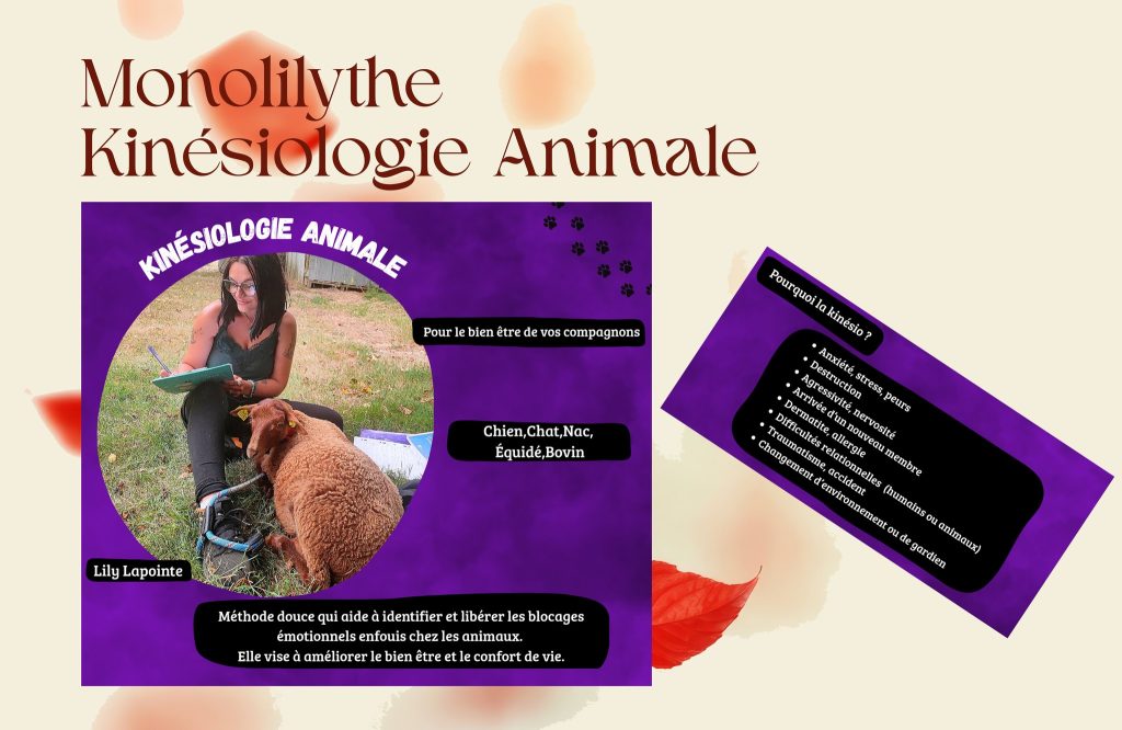 Lily peut s’occuper de vos chouchous, chiens, chats, NAC, équidés, bovins, au travers de la kinésiologie animale, cette méthode douce qui aide à identifier et libérer les blocages émotionnels enfouis chez les animaux. Elle vise à améliorer le bien-être et le confort de vie, en travaillant sur l’anxiété, la peur, le stress, la destruction, l’agressivité, la nervosité, les difficultés relationnelles et bien d’autres encore. @monolilythe